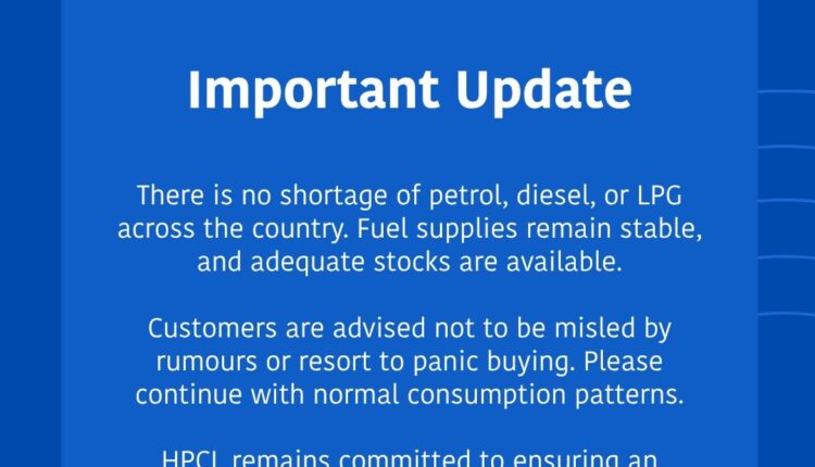 पेट्रोल-डीजल की कमी की अफवाह के बीच हिन्दुस्तान पेट्रोलियम कॉर्पोरेशन लिमिटेड ने भी अपनी आधिकारिक पोस्ट के जरिए कहा कि – ”देश भर में पेट्रोल-डीज़ल या एलपीजी की कोई कमी नहीं है… ईंधन की आपूर्ति स्थिर है और पर्याप्त मात्रा में स्टॉक उपलब्ध है…
