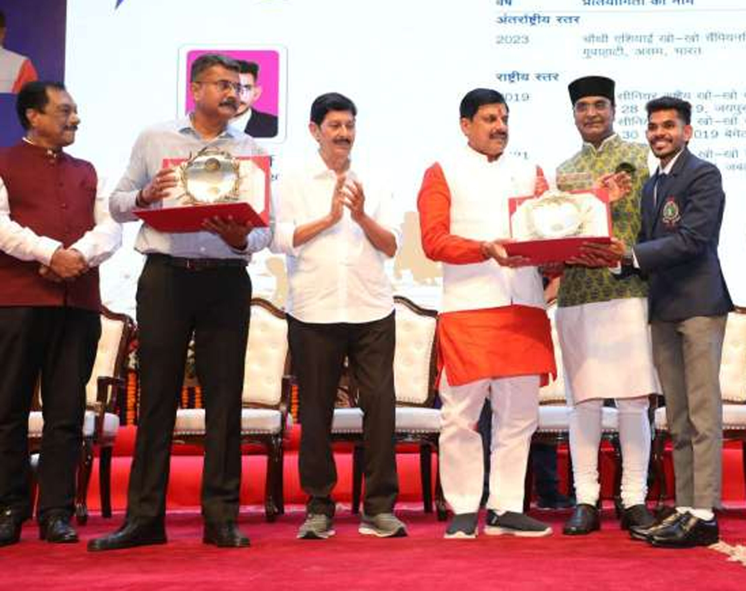 भोपाल। राजधानी भोपाल के रविंद्र भवन स्थित सभागार में बुधवार को मध्य प्रदेश शिखर खेल अलंकरण एवं 38वें नेशनल गेम्स 2025 के पदक विजेता खिलाड़ियों का सम्मान किया गया। इसमें विभिन्न श्रेणी के 82 खिलाड़ी शामिल थे। इनमें 34 स्वर्ण, 25 रजत और 23 कांस्य पदक विजेता शामिल थे। इस वर्ष 12 विक्रम, 11 एकलव्य, 3 विश्वामित्र और एक लाइफ टाइम अचीवमेंट पुरस्कार दिए गए हैं। इस साल 3 अनुभवी कोच को भी विश्वामित्र पुरस्कार से सम्मानित किया गया है। इन सभी खिलाड़ियों को मुख्यमंत्री डॉ. मोहन यादव ने पुरस्कार प्रदान किए।
