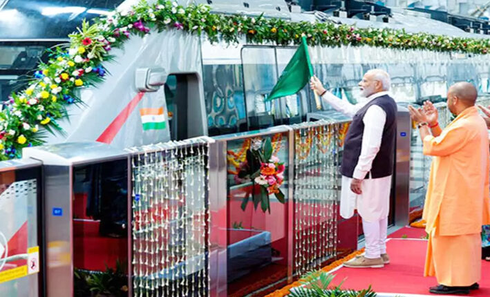 मेरठ। प्रधानमंत्री नरेंद्र मोदी ने रविवार को मेरठ के शताब्दी नगर स्टेशन पर आयोजित भव्य कार्यक्रम में ‘नमो भारत’ रीजनल रैपिड ट्रेन और बहुप्रतीक्षित मेरठ मेट्रो का उद्घाटन किया। हरी झंडी दिखाकर दोनों ट्रेनों को रवाना करते हुए प्रधानमंत्री मोदी ने इसे पश्चिमी उत्तर प्रदेश के लिए ऐतिहासिक क्षण बताया। इस मौके पर उत्तर प्रदेश के मुख्यमंत्री योगी आदित्यनाथ ने उनका स्वागत किया। नमो भारत ट्रेन के संचालन के साथ मेरठ से दिल्ली तक का 88 किलोमीटर का सफर अब महज 55 मिनट में पूरा किया जा सकेगा। यह ट्रेन 13 स्टेशनों से होकर गुजरेगी, जिनमें दो स्टेशन अंडरग्राउंड हैं। इस परियोजना के साथ भारत उन चुनिंदा देशों की श्रेणी में शामिल हो गया है, जहां एक ही ट्रैक पर हाई-स्पीड रीजनल रेल और स्थानीय मेट्रो का सफल संचालन संभव हुआ है।