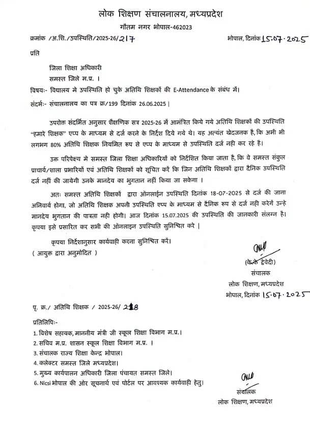 लोक शिक्षण संचालनालय ने प्रदेश के सभी जिला शिक्षा अधिकारियों को एक पत्र जारी किया है इस पत्र में स्कूलों में पदस्थ अतिथि शिक्षकों के लिए ई अटेंडेंस पर सख्ती की बात कही गई है, संचालक ने पत्र में उल्लेख किया है कि शैक्षणिक सत्र 2025-26 में आमंत्रित किये गए अतिथि शिक्षकों को हमारे ऐप पर अटेंडेंस लगाने के निर्देश दिए गए हैं सबसे बड़ी बात तो ये है कि अभी भी 80 प्रतिशत अतिथि शिक्षक ऐप पर अटेंडेंस नहीं लगा रहे।