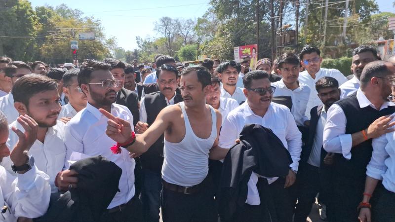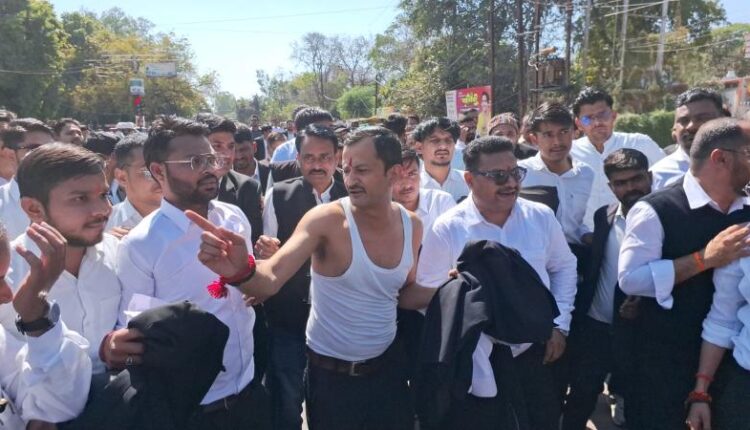छतरपुर। शिवपुरी जिले के करैरा में 14 फरवरी को दिनदहाड़े अधिवक्ता संजय कुमार सक्सेना की गोली मारकर हत्या के विरोध में छतरपुर जिला अधिवक्ता संघ के सदस्य आज सड़कों पर उतर आए। अधिवक्ताओं ने कलेक्टर कार्यालय पहुंचकर ज्ञापन सौंपने का प्रयास किया, लेकिन किसी अधिकारी ने आवेदन नहीं लिया। लंबे इंतजार के बाद नाराज अधिवक्ताओं ने जोरदार नारेबाजी की और फिर सड़क पर निकलकर आकाशवाणी तिराहे पर चक्का जाम कर दिया। इस दौरान कुछ अधिवक्ता कपड़े उतारकर सड़क पर लेट गए। लगभग दो घंटे तक जाम लगाए रहने के बाद अधिवक्ताओं ने आपसी सहमति बनाई और छत्रसाल चौराहे पर आकर जूता पॉलिश करने वाले मोची को ज्ञापन सौंपा।